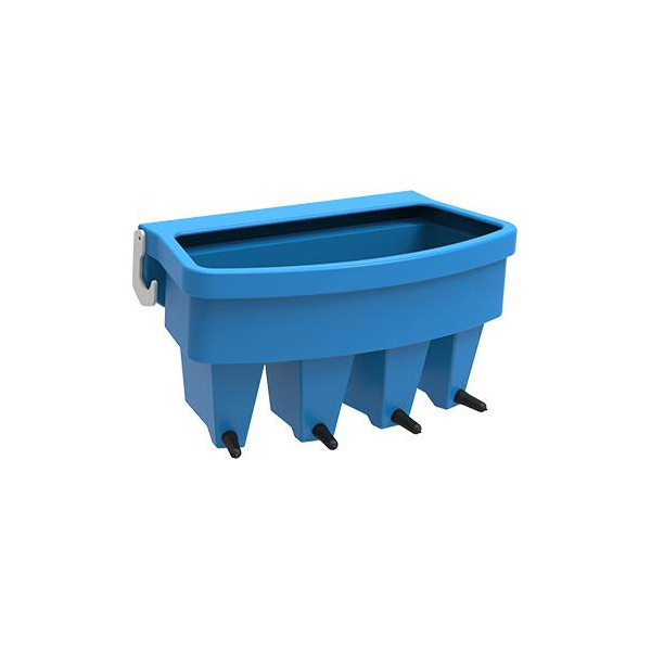 Karmidła czterosmoczkowe dla cieląt zapewniają skuteczny sposób dostarczania mleka cielęciu. Każdy podajnik jest wyposażony smoczkowy zawór zwrotny, aby dostarczać mleko grawitacyjnie. Smoczki są skonstruowane tak, aby pobudzić odruch ssania, zapewniając optymalną ilość mleka dla cieląt. Karmidło jest wyposażone w dwa mocne haki, dzięki którym możemy je umieścić w wielu miejscach gospodarstwa (brama, ogrodzenie). Idealne do użytkowania z domkiem dla cieląt JFC (zawieszenie na wygrodzeniu). Skonstruowane z minimalnymi szczelinami, umożliwiają dbałość o higienę i ułatwiają czyszczenie. Mogą być przechowywane do góry dnem, co przyspiesza ich ociekanie i osuszanie. Łatwe w magazynowaniu i transporcie (można piętrować jedno karmidło na drugie).
