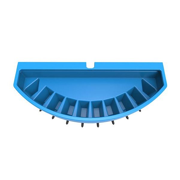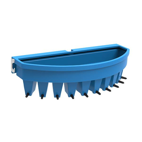 Karmidła dziesięciosmoczkowe dla cieląt zapewniają skuteczny sposób dostarczania mleka cielęciu. Każdy podajnik jest wyposażony smoczkowy zawór zwrotny, aby dostarczać mleko grawitacyjnie. Smoczki są skonstruowane tak, aby pobudzić odruch ssania, zapewniając optymalną ilość mleka dla cieląt. Karmidło jest wyposażone w dwa mocne haki, dzięki którym możemy je umieścić w wielu miejscach gospodarstwa (brama, ogrodzenie). Idealne do użytkowania z domkiem dla cieląt JFC (zawieszenie na wygrodzeniu). Skonstruowane z minimalnymi szczelinami, umożliwiają dbałość o higienę i ułatwiają czyszczenie. Mogą być przechowywane do góry dnem, co przyspiesza ich ociekanie i osuszanie. Łatwe w magazynowaniu i transporcie (można piętrować jedno karmidło na drugie).