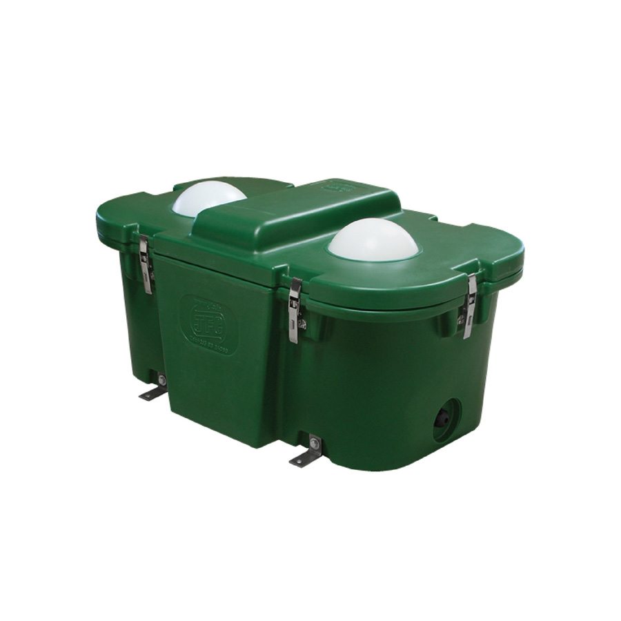 Poidła izolowane firmy JFC są wykonane z wysokiej jakości polietylenu. Podwójne ściany poideł wypełnione są pianką poliuretanową, która utrzymuje optymalną temperaturę wody nawet w ekstremalnych warunkach klimatycznych.Woda chroniona jest przez specjalną pokrywę, którą można łatwo otworzyć za pomocą klucza nasadowego. Zwierzęta mają dostęp do wody poprzez naciskanie białej kuli. Odpowiednie użytkowanie poideł zapobiega zamarzaniu wody nawet w temperaturze -25ºC. Główną zaletą tych poideł jest to, że nie wymagają zasilania elektrycznego, jak inne poidła niezamarzające. Są również bardzo efektywne przy utrzymywaniu chłodnej wody podczas ciepłych dni. Każde poidło wyposażone jest w zawór pływakowy o przepustowości 36L/min, duży korek spustowy (75mm), 1 lub 2 białe kule dostępowe, elastyczny wężyk w oplocie stalowym ½” (aby doprowadzić wodę od spodu poidła) i 1 metr otuliny izolacyjnej do przewodu wodnego. Przygotowane cztery otwory montażowe zapewniają bezpieczną instalację do podłoża.